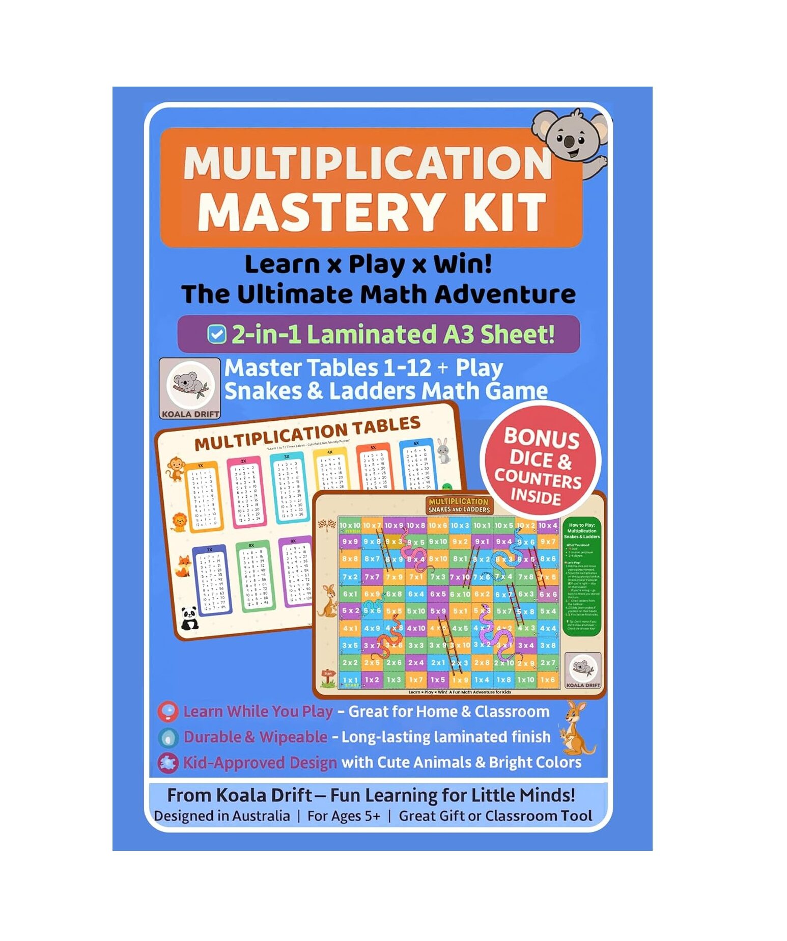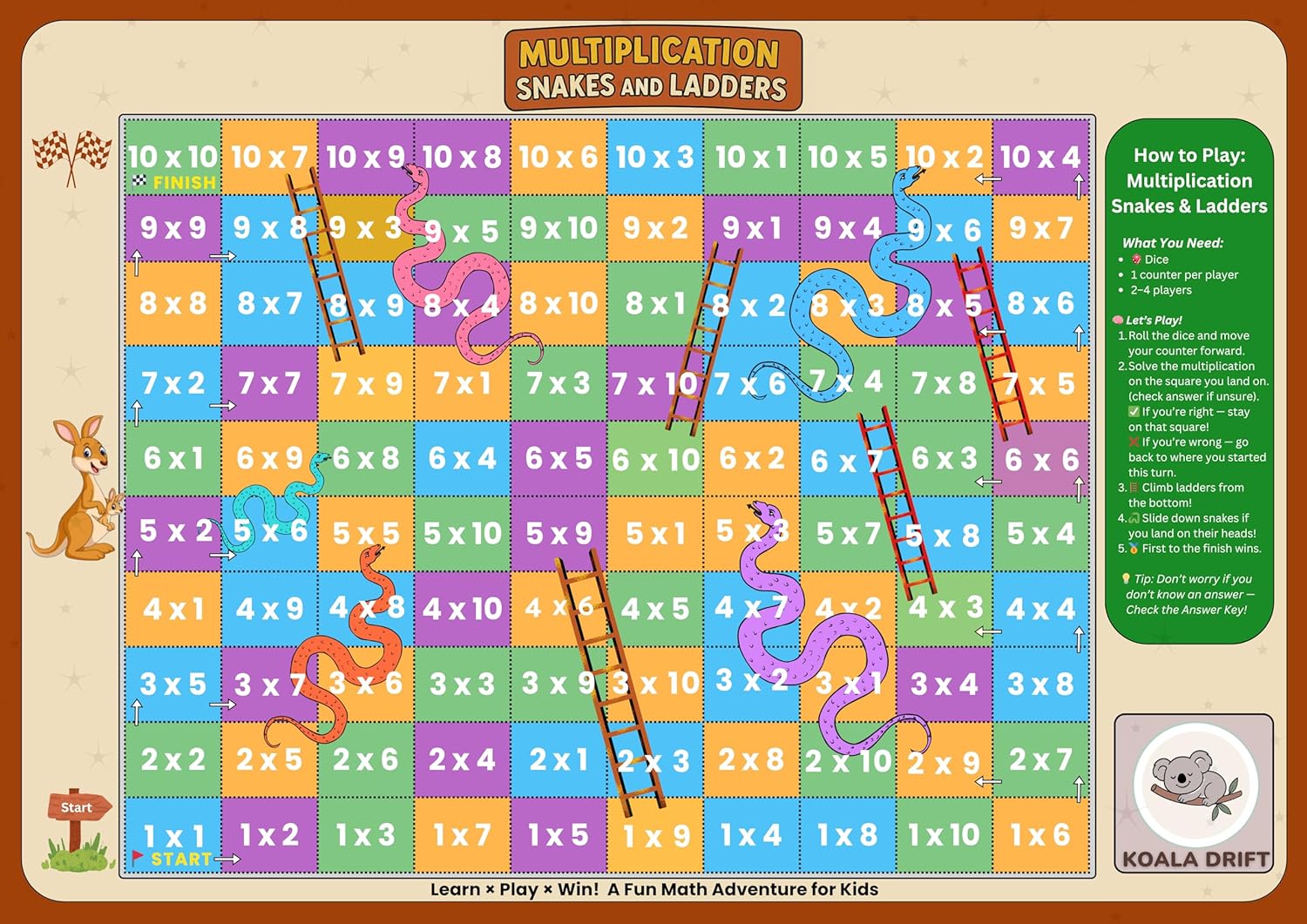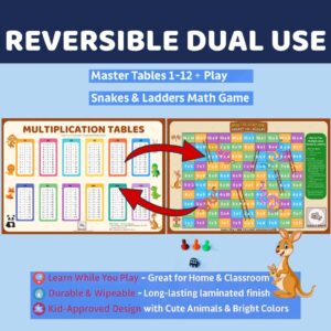 The Reversible Multiplication Tables & Snakes Ladders Math Game by Koala Drift turns maths practice into an engaging, hands-on experience. With two learning activities in one mat, children can switch between structured table learning and playful problem-solving.