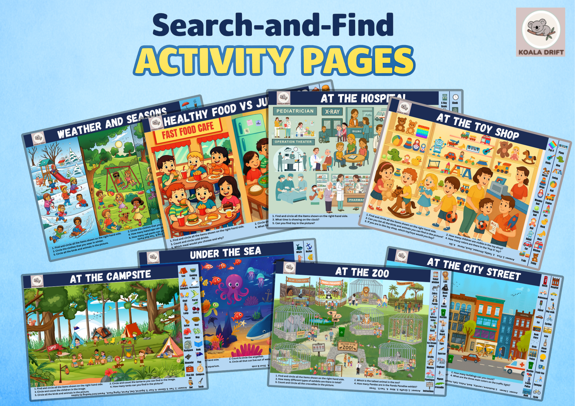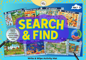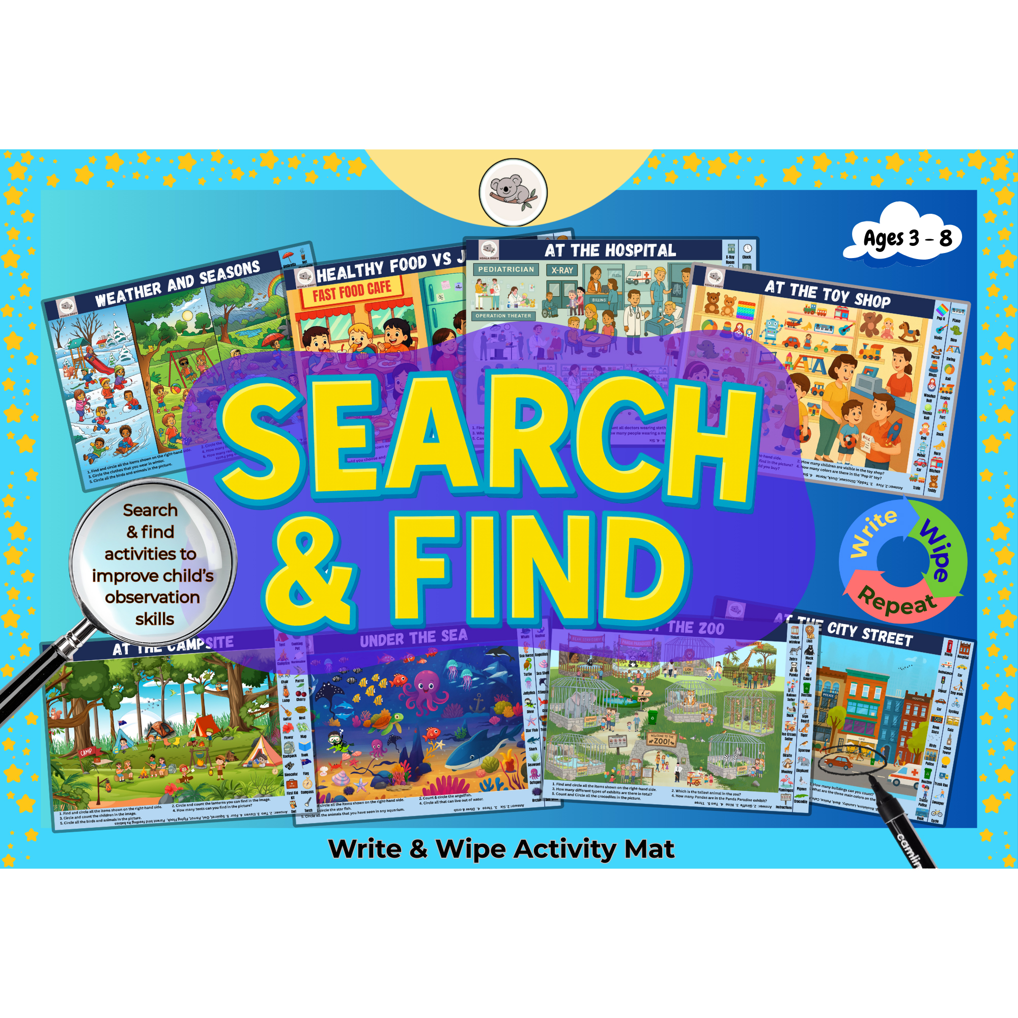 The Search & Find Write & Wipe Activity Mat by Koala Drift is an engaging learning tool designed for children aged 3 to 8 years. Packed with bright, detailed scenes, it encourages kids to carefully observe, search, circle, count, and identify objects—building essential early learning skills through play.